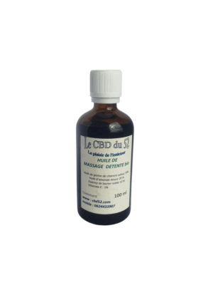 79% d’huile de graines de chanvre, 5ml d’huile de CBD, 1% d’essence de laurier, 20 % d’huile d’amande douce.